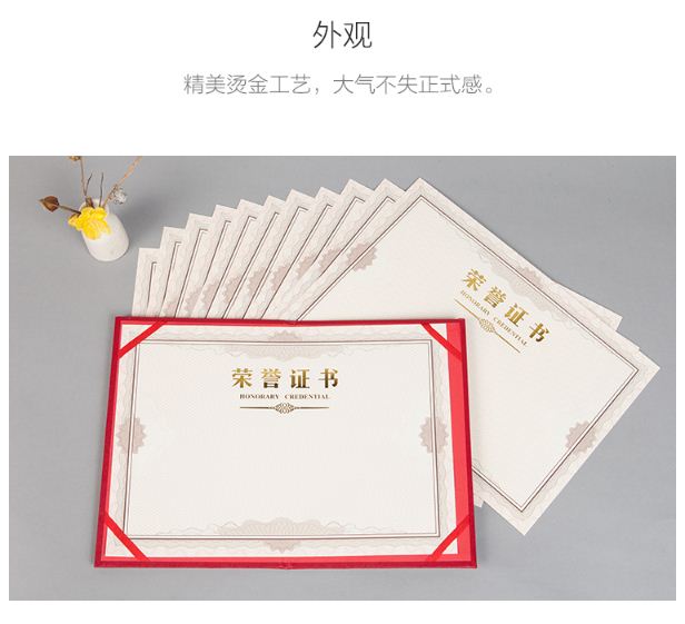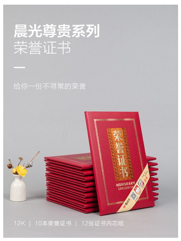 商品名称:晨光(M&G)尊贤系列12K/230*157mm红色特种纸荣誉证书 商品编号:095581 品牌:晨光 上架时间:2019-06-04 商品毛重:1.370千克